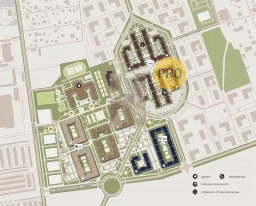 В комплексе предусмотрены: собственные школа и детский сад, парк, медицинский центр, променад с аллеями и ландшафтным дизайном, закрытые благоустроенные дворы с зонами work out, а также кладовые в домах.Расположение
