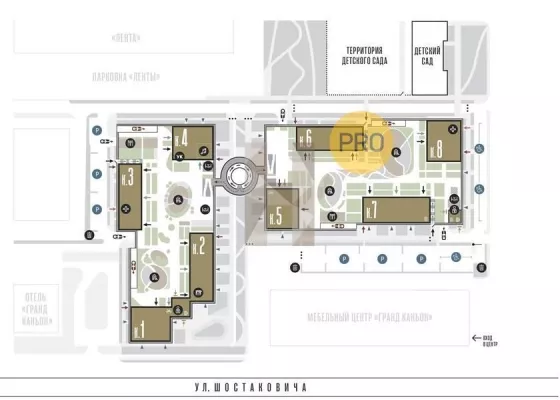 Двор разделен на тематические зоны: для детей, подростков и взрослых. Детская игровая зона удалена от мест для релаксации и находится на своеобразном подиуме.Расположение
