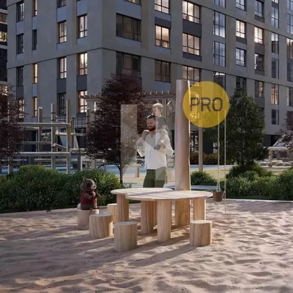 Внутреннее пространство двора закрыто от внешнего мира. Двор располагается на стилобате, на уровне второго этажа, и охраняется круглосуточно. Попасть сюда можно только при наличии электронного ключа или по приглашению. Пейзажный парк, живописный ручей, уединенные пространства с лежаками, спортивные зоны, качели и огромные песочницы. В тихих уголках двора, можно и отдохнуть, и поработать.