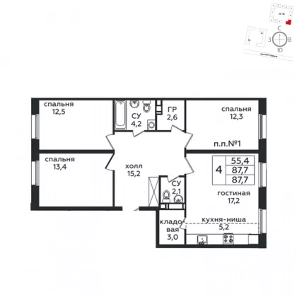 | Жилая площадь | 55.4 |