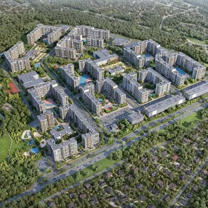 ЖК «Эко Бунино» это 19 монолитных домов окруженные с трех сторон густыми лесопарками и расположенные вдоль живописной береговой линии реки Сосенки.
