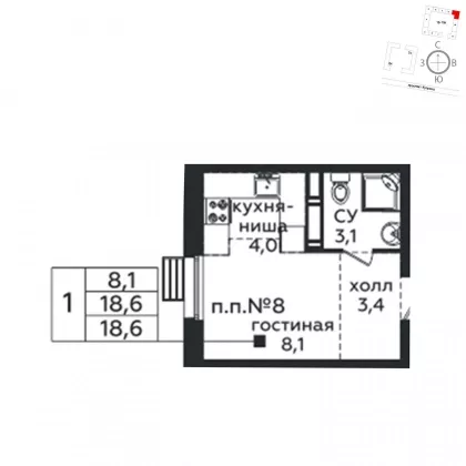 Продается 1-комнатная квартира общей площадью 18.6 кв.м., на 11 этаже. Жилой комплекс ЖК "ЭкоБунино" располагается по адресу г Москва, поселение Сосенское, деревня Столбово, тер СНТ Рассвет. Полное завершение строительства намечено на IV квартал 2024 года.