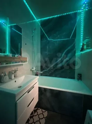 Отдельно стоит отметить крутую ванную с подсветкой. Во всех помещениях есть яркий основной свет и дополнительные источники освещения.