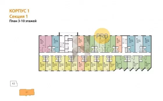 Апарт-отель состоит их двух корпусов – большого (10-13-этажный) и малого (13-этажный). Всего в двух корпусах 357 апартаментов площадью от 19,8 до 55,0 кв. метров. В большом корпусе 249 апартаментов, в малом – 108.