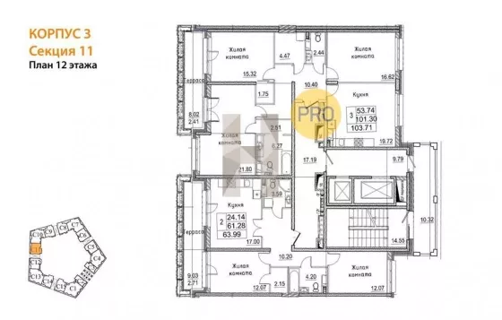 Квартира: 3 к 103,71 кв.м., 12 этаж в комплексе Ариосто, 1 очередь, корп.3, сдача: 4кв. , этажей: 12, адрес Глухарская ул., , Застройщик: Arsenal.