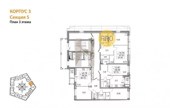Квартира: 1 к 47,91 кв.м., 3 этаж в комплексе Ариосто, 1 очередь, корп.3, сдача: 4кв. , этажей: 12, адрес Глухарская ул., , Застройщик: Arsenal.