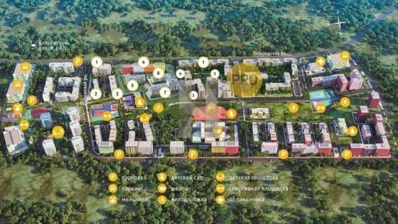 Предусмотрена своя инфраструктура: продуктовые магазины и кафе, аптеки и кабинеты семейных врачей, банк и книжный магазин, хозтовары и ремонт техники и т. д.Расположение