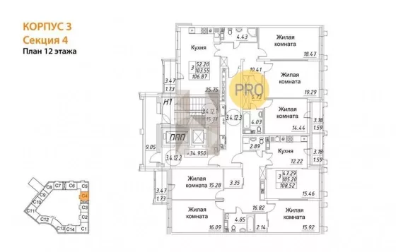 Квартира: 3 к 106,87 кв.м., 12 этаж в комплексе Модум, 1 очередь, корп.3, сдача: 2кв. , этажей: 12, адрес Глухарская ул., д. 54/стр.1, Застройщик: Arsenal.