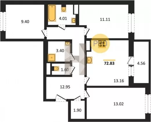 Квартира: 3 к 72,83 кв.м., 9 этаж в комплексе ID Кудрово, 1 очередь, корп.4.2, сдача: 1кв. , этажей: 12, адрес Строителей пр., д. 1/2, Застройщик: Euroinvest Development.